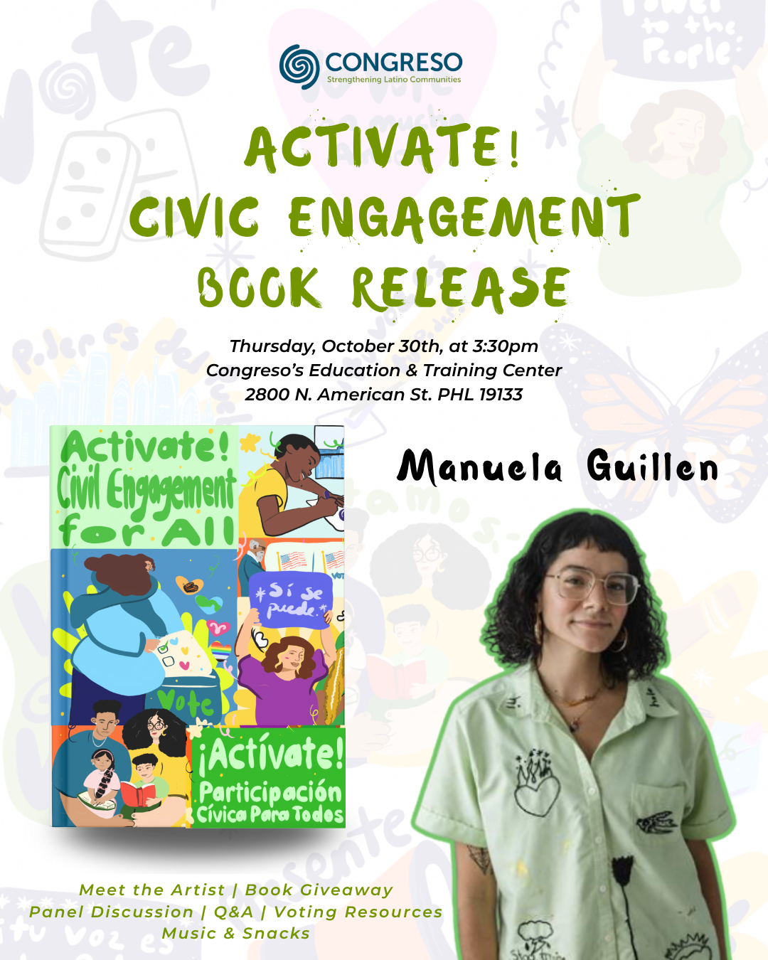 With the November 4th election in PA approaching, Congreso is inviting the community to the release of our new bilingual civic engagement activity book, 'Activate!'. Join us next Thursday, October 30th as we give out books and sticker pages hot off the press! We will also hear from Manuela Guillen, the graphic designer and artist...